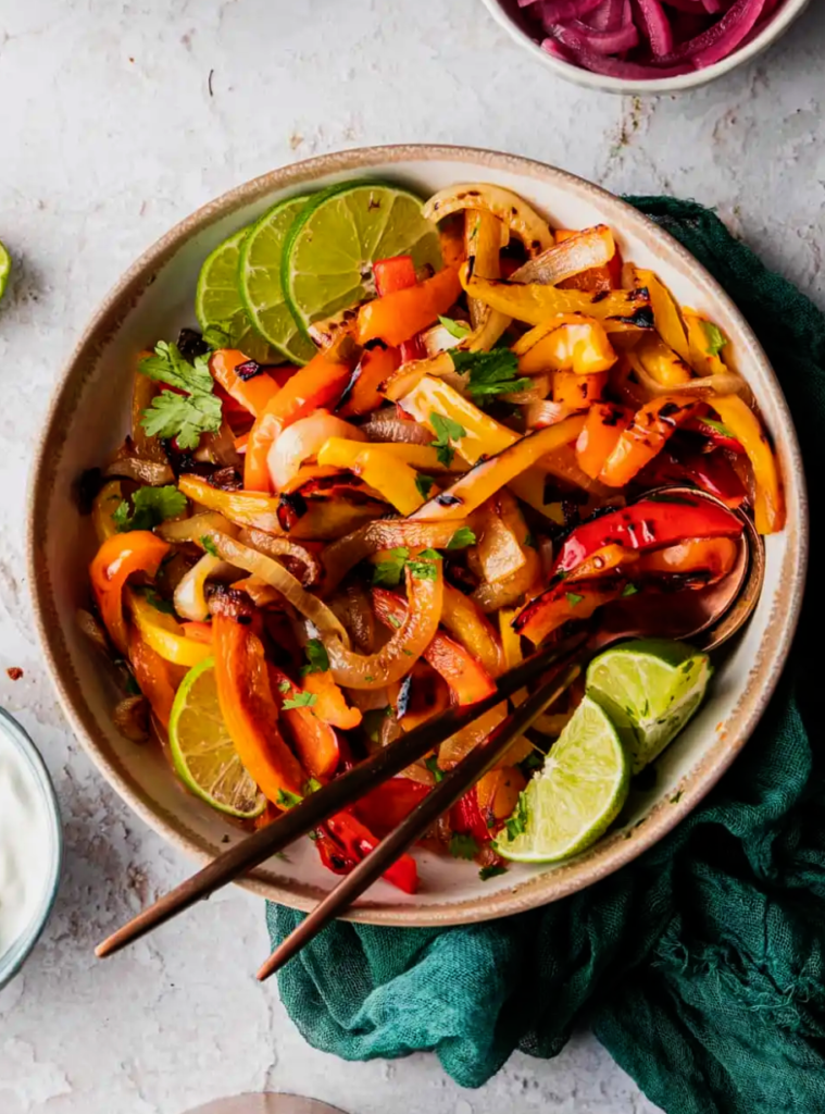 SautƩed peppers and onions, seasoned with spices and perfect for adding to any dish.