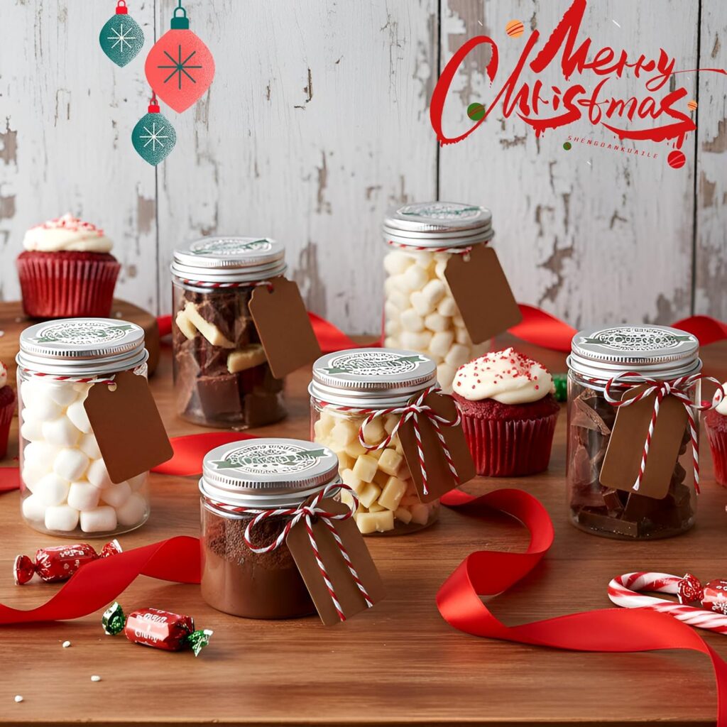The set comes with 30 plastic hot chocolate jars with lids—20 small jars and 10 larger ones—plus 30 hot cocoa stickers, 30 blank tags, and a bundle of red and white rope.
