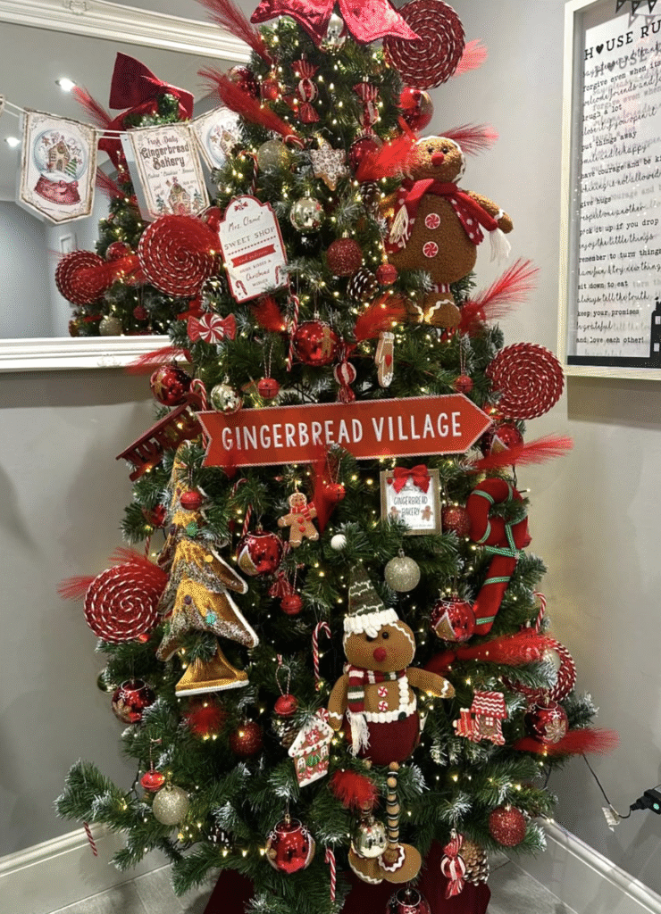 It doesn’t have to be all plain balls and baubles; little gingerbread men, cookies, and candy-shaped ornaments with warm colors can do just the trick.