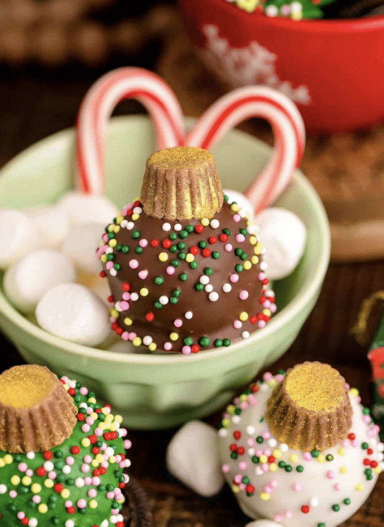Think of these as holiday truffles dressed up for the party, with sprinkles and a Reese’s Cup hat.