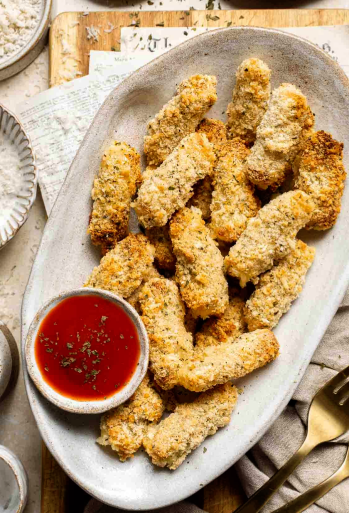 Try this crispy outside an gooey on the inside Baked Mozzarella Sticks by Ahead of Thyme. You can make this with a bunch of pantry staples. The best part? These crispy sticks are not friend but baked so you will not feel heavy. Make sure to serve with marinara sauce.