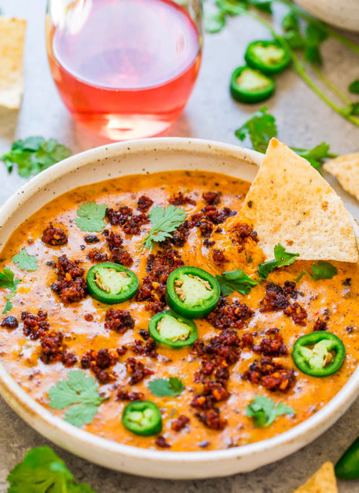Try this spicy chorizo queso by Averie cooks for your next party or game day! Made without processed cheese, this easy dip is ready in just 20 minutes and packed with bold, spicy flavor that everyone will love.