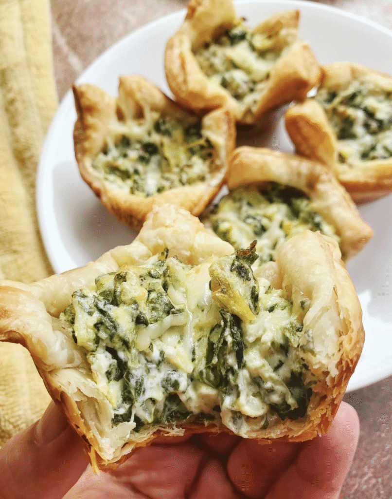 Each bite features melty spinach and artichoke dip tucked inside a flaky puff pastry cup.