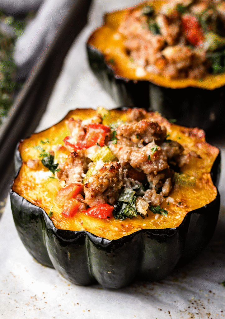 This is my fall fav! This sausage stuffed acorn squash by therecipewell is cozy, flavorful, and so easy to make. Perfectly roasted squash is filled with Italian sausage, colorful veggies, and topped with parmesan for the ultimate comfort meal. With just 10 ingredients, it’s great for weeknights and impressive enough for holiday gatherings or special dinners.