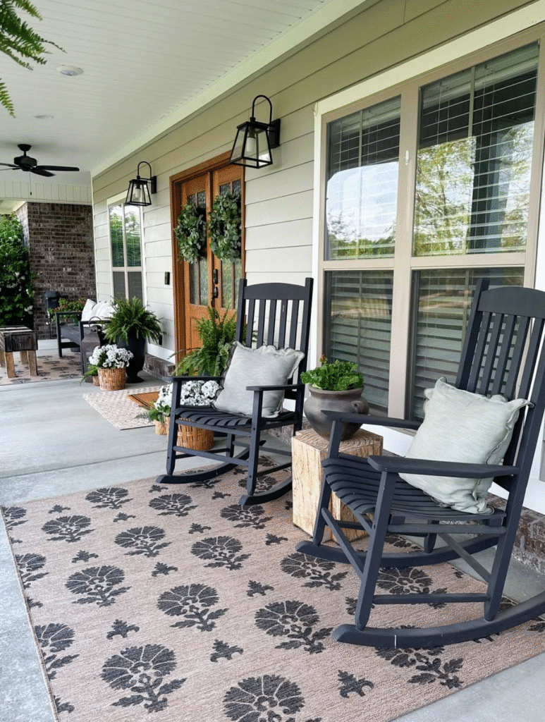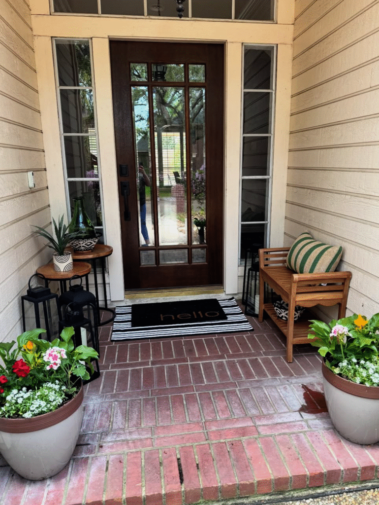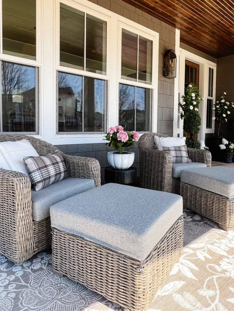 A cozy seating area with outdoor cushions instantly makes your front porch feel inviting and comfortable.