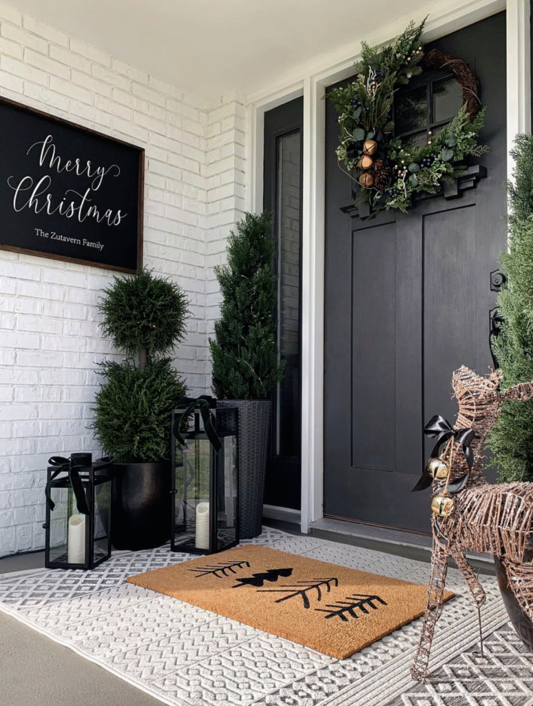 Choose seasonal plants or flowers for a fresh look and warm lantern lighting to make your entryway feel welcoming.