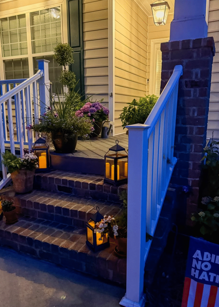 Place the potted plants near the steps or along the sides, and position the lanterns to softly brighten the area.