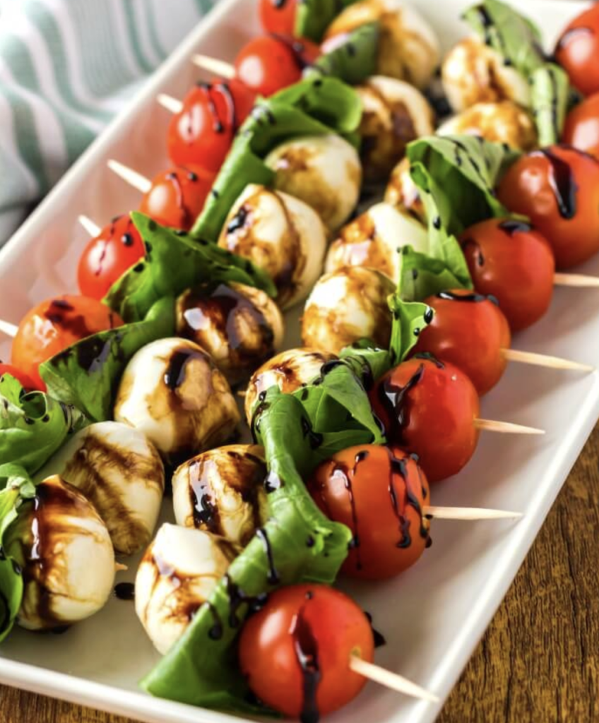 For the skewers, include cherry tomatoes, fresh mozzarella balls, and basil leaves.