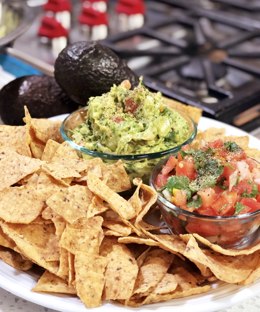 All you need are crunchy tortilla chips, a creamy guacamole, and a fresh salsa with tomatoes, onions, and a little lime.