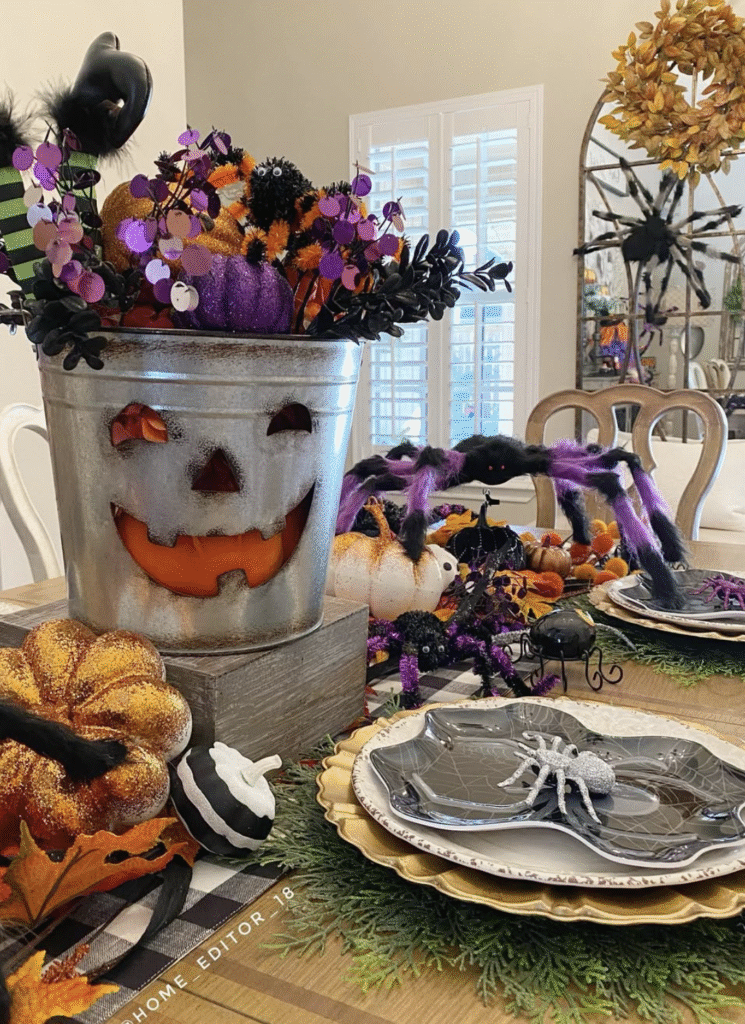 A creepy-faced bucket grinning from the center of the table, overflowing with spiders that look ready to scatter across the runner. Equal parts camp and fright, it’s dinner-theatre spooky at its best. The perfect Halloween centerpiece when you want your bucket to steal the show.