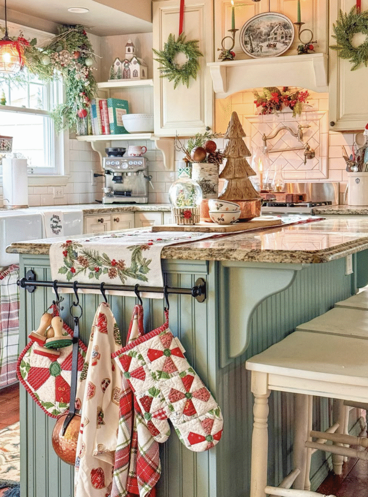 You’ll also find ideas like hanging candy canes, festive dish towels, and little ornaments that turn cabinets into instant showstoppers.