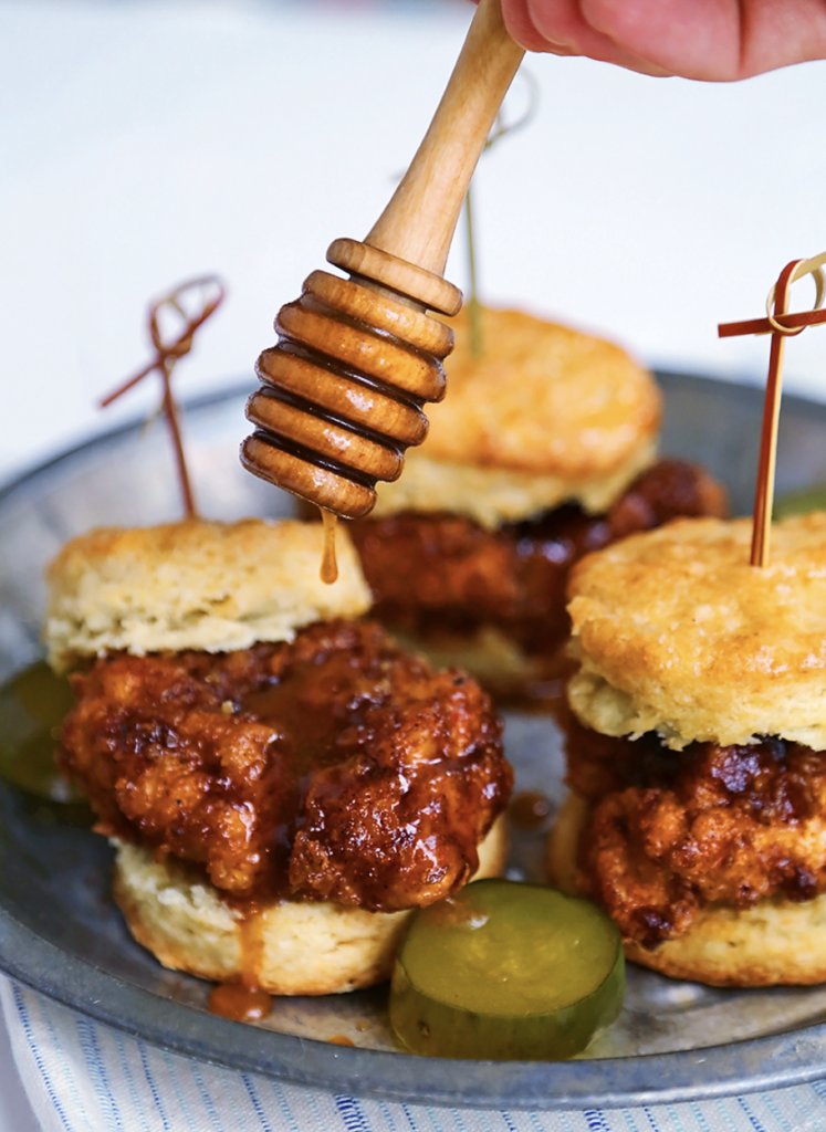 I swear, you’ll fall in love after one bite. You get crispy, juicy chicken tucked into a soft, flaky biscuit, then that drizzle of sweet spicy hot honey on top.