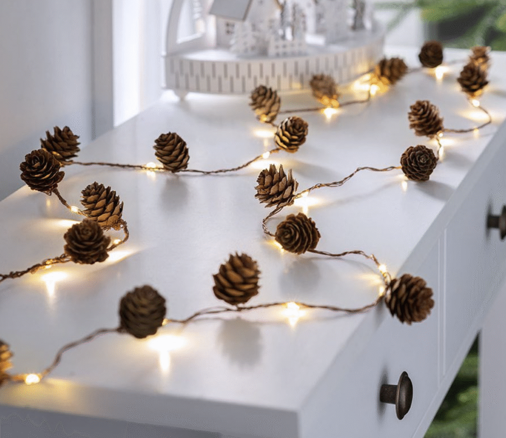 You can string together pinecones of different sizes for a natural look, or stick to one size and add string lights for a warm, cozy style that people love during the holidays.
