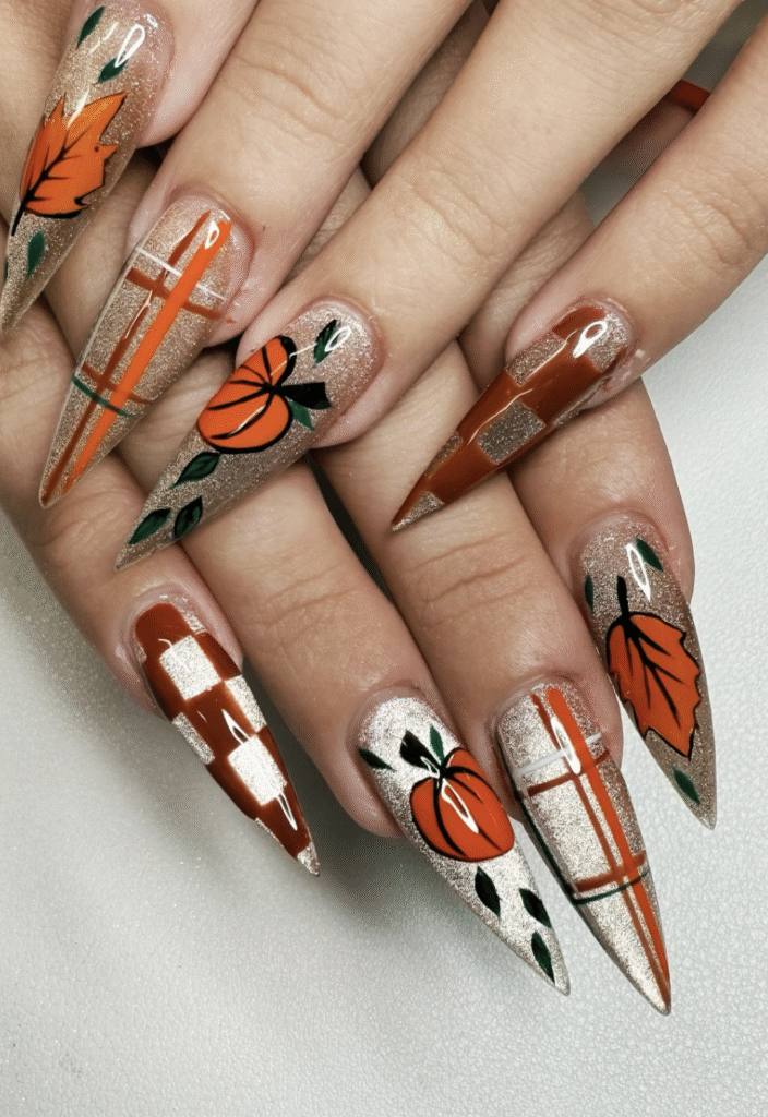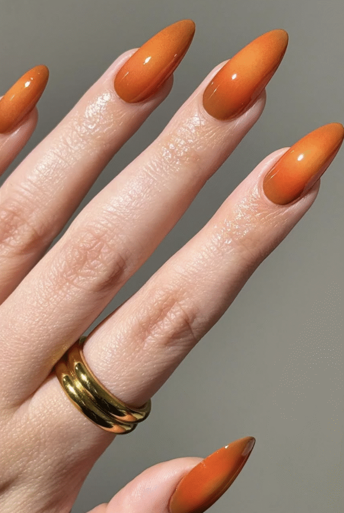 Love warm and sweet designs? You don’t have to stick with just basic orange. Try copper chrome nails, cinnamon swirl art, or latte-inspired ombré. Feeling extra festive? Add gold flakes, sweater knit textures, or cute pumpkin decals to turn your manicure into a cozy fall masterpiece.