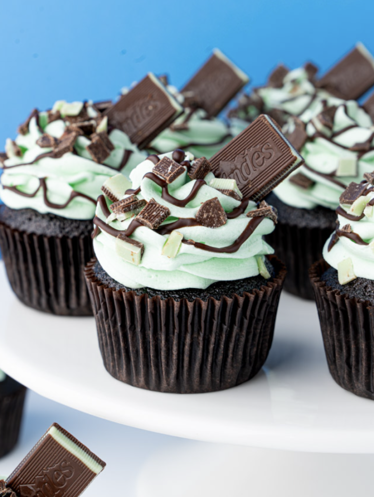 Imagine rich, moist dark chocolate cupcakes topped with cool, creamy mint buttercream, finished with silky chocolate ganache and bits of mint chocolate candy.