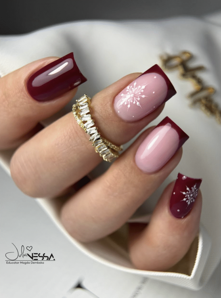 Classic deep red tones are paired with delicate white snowflakes over a glossy base to create this rich and festive winter manicure.