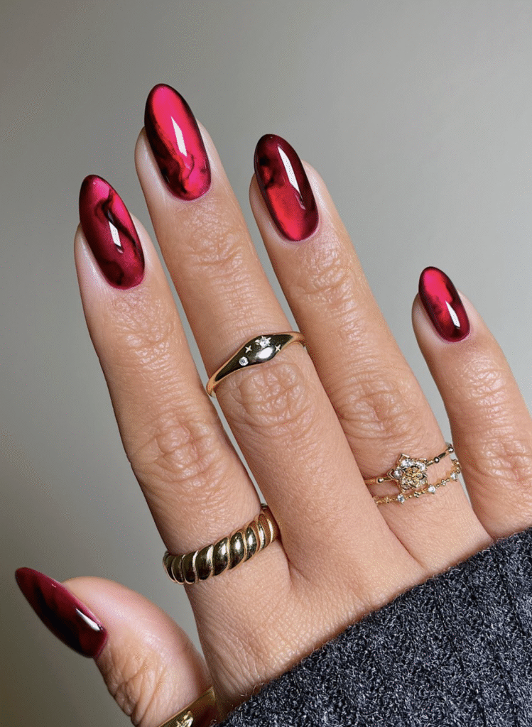 This rosy marble design features a soft red base layered with silver polish to create elegant swirling effects that shimmer beautifully in the light.