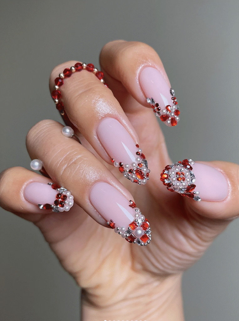 Bring a frosty glam vibe into your manicure by pairing icy French tips with colorful crystal stones. Think soft milky bases topped with pops of ruby, sapphire, emerald, and amethyst for a look that feels both wintery and ultra-luxe.
