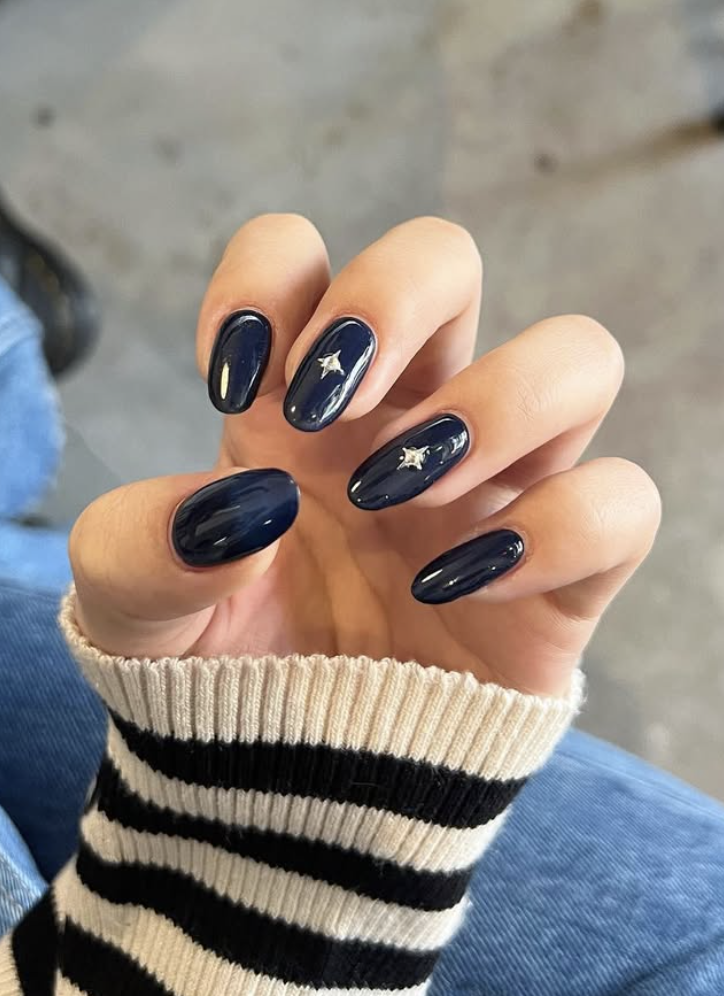 This striking look features a deep navy base topped with tiny shimmering star details. The richness of the dark blue and the soft sparkle of the stars come together to create a bold yet dreamy night-sky effect.