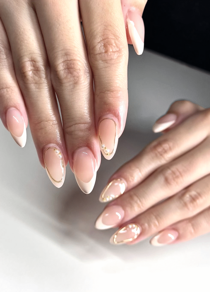 Tiny pearls placed along peppermint-style French tips make it look like delicate beads are lining the edges of the nails. They glow softly over a clean base, giving the whole set a sweet, polished finish.