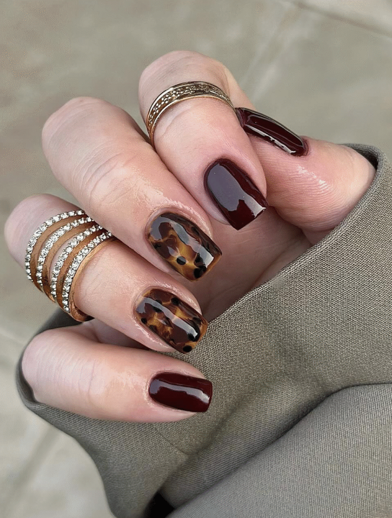 If bold and bright designs are not really your thing, you can switch up your neutral manicure with hand painted tortoise details made using a mix of gel colors. It keeps the look soft and classy while still adding that rich, glossy tortie effect that feels trendy and polished.