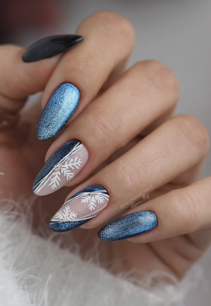 Nail artist Anna Flis layered shimmering blue polish with delicate snowflake details to create this set. The result? A frosty, multidimensional winter manicure that looks like sparkling snow under moonlight and feels perfect for cold-weather glam.