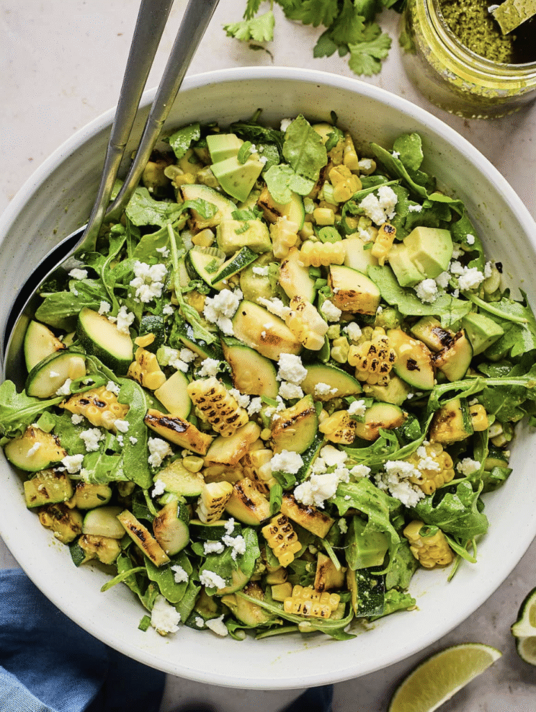 You know what? This grilled corn and zucchini salad is summer on a plate! With smoky grilled zucchini and corn, fresh arugula, creamy avocado, green onions, and crumbled queso fresco, it’s tossed in a bright cilantro lime vinaigrette. Light, fresh, and flavorful, it’s the perfect side for any summer meal.